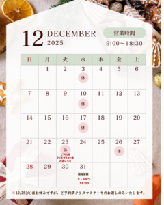 ※通常毎水曜日が定休日ですが12月~1月は変動がございます