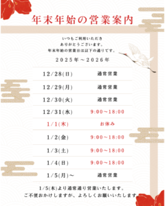 12/31(水) 1/2 (金) 1/3(土) 1/4 (日)の4日間は短縮営業となります(18時閉店)